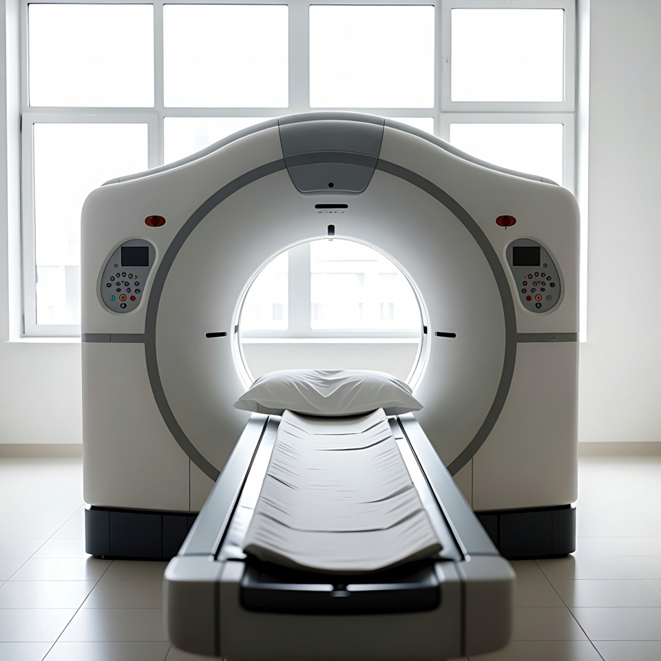 CT scanner, MRI machine, clean room, control panels, cylindrical bore, empty bed, gray base, healthcare, hospital room, hospital scanner, large windows, medical equipment, medical imaging, modern scanner, natural light, pillow, radiology, red buttons, white machine, white sheet, MRI scanner