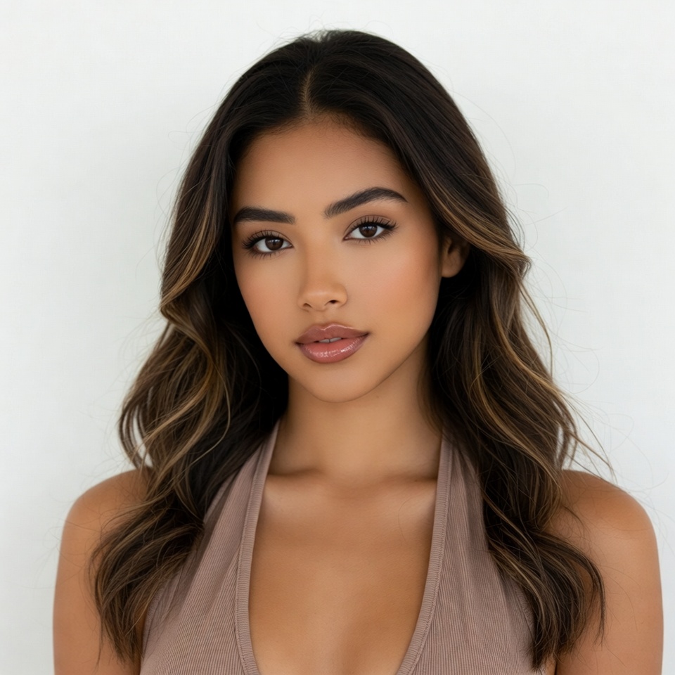 A young Asian woman with long wavy dark brown hair and highlights poses for a close-up portrait on a white background. She has almond-shaped eyes, full lips with glossy makeup, and wears a beige off-shoulder top. Her expression is confident and direct to the camera.