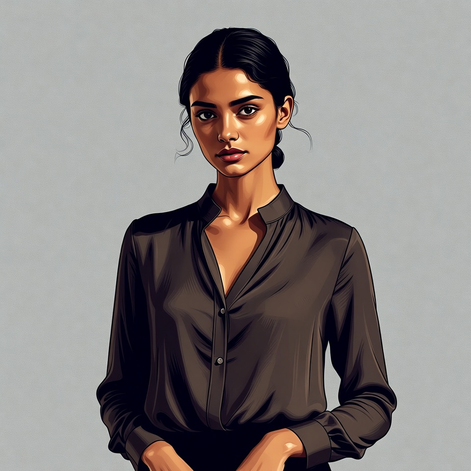 A digital illustration of a young Asian woman with long dark hair in a bun, featuring striking facial features and glowing skin. She wears a brown collared blouse with buttons and stands against a plain gray background. Her expression is neutral with hands clasped in front.