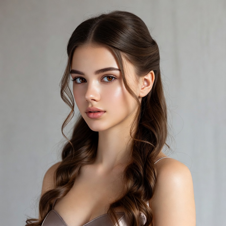 A young woman with long wavy brown hair styled in a half-updo gazes directly at the camera. She has striking brown eyes, full lips, and flawless skin with a subtle glow. She wears a thin-strapped top against a plain gray background.