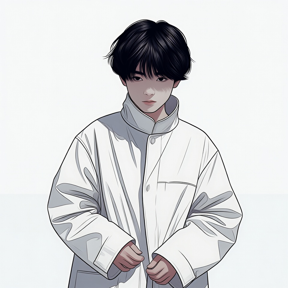 Asian, anime style, black hair, boy portrait, buttons, collar, digital art, front view, hands clasped, illustration, isolated background, male, neutral expression, oversized jacket, portrait, stylish clothing, white background, white jacket, young boy, anime boy