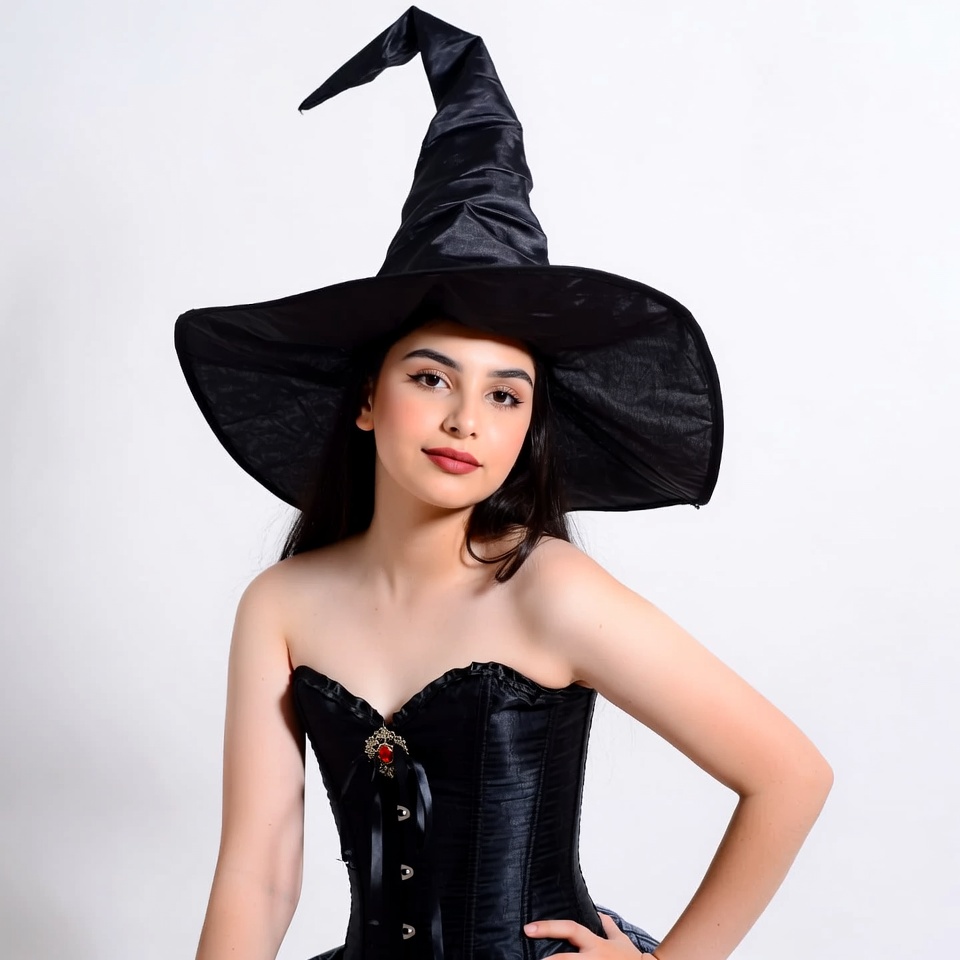 A young girl with long dark hair wears a large black pointed witch hat and a black corset with lace details. She stands smiling with hands on hips against a plain white background. Her makeup includes red lips and dark eyeliner.