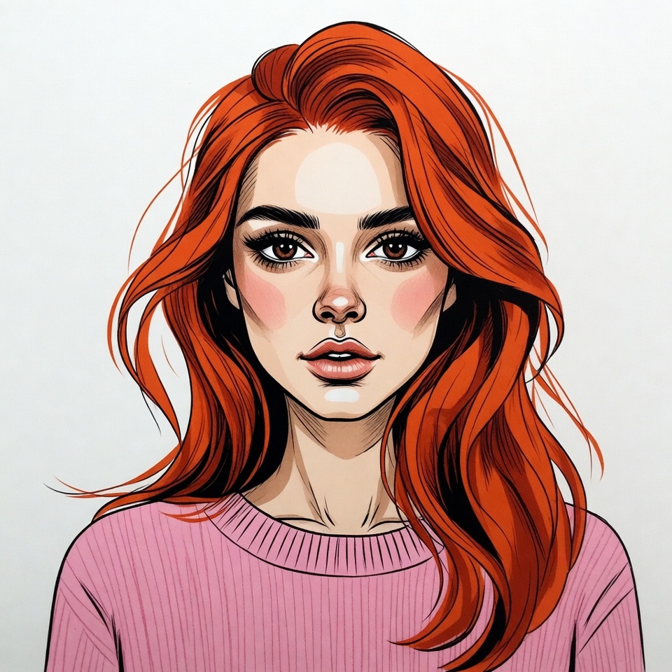 A digital illustration of a young woman with long wavy red hair and striking makeup stares forward. She wears a soft pink sweater and has a fair complexion with defined cheekbones and full lips. The portrait is set against a plain white background.