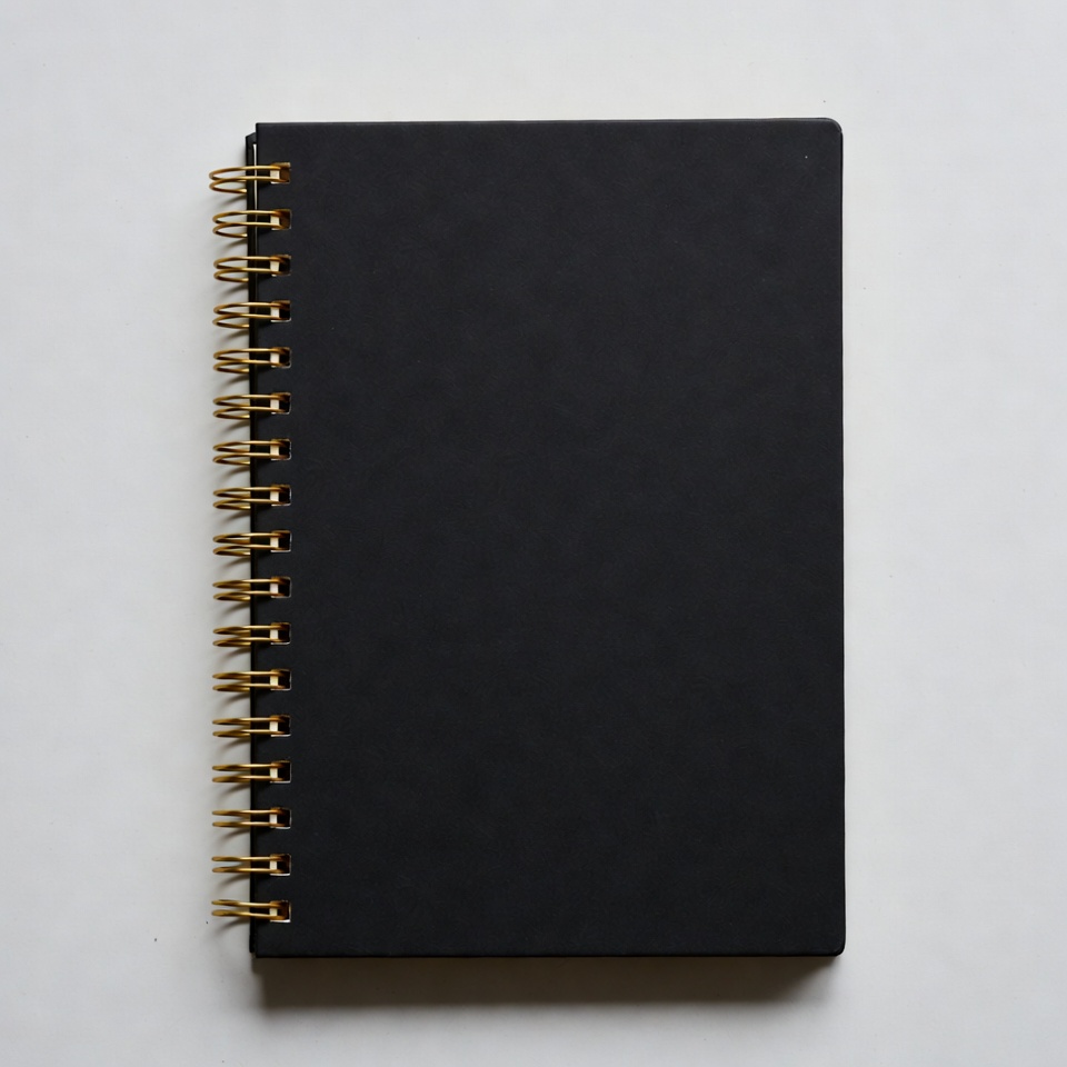 black notebook, blank notebook, gold coils, hardcover notebook, isolated background, journal, office supply, spiral bound, spiral notebook, stationery, white background, notebook