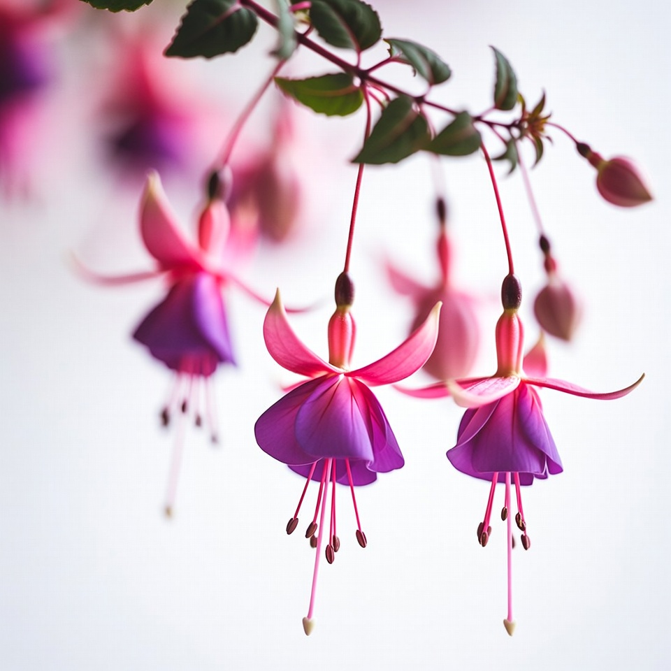 blooming, delicate, flower buds, fuchsia flowers, green stems, hanging flowers, leaves, nature, petals, pink flowers, plant, purple flowers, stamens, vibrant, white background, fuchsia