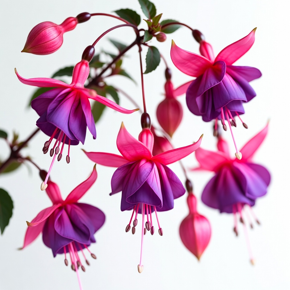 blooming fuchsia, floral arrangement, flower buds, flower cluster, fuchsia, green leaves, hanging flowers, isolated flowers, petals, pink flowers, purple flowers, stamens, vibrant flowers, white background, fuchsia flowers
