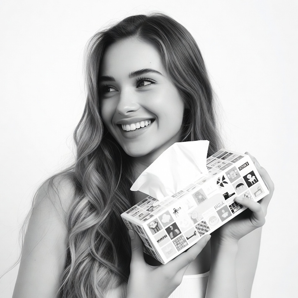 A young woman with long wavy hair smiles happily while holding a rectangular tissue box with colorful patterns. She has a joyful expression with bright eyes and wears a sleeveless top. The image is in black and white against a plain white background.