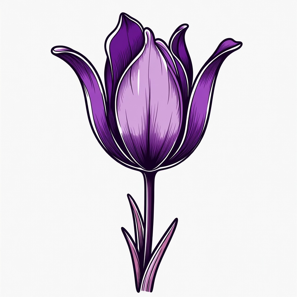blooming tulip, clipart, drawing, floral, flower, flower illustration, illustration, isolated background, leaves, line art, petals, purple flower, purple petals, stem, tulip, tulip flower, vector flower, purple tulip