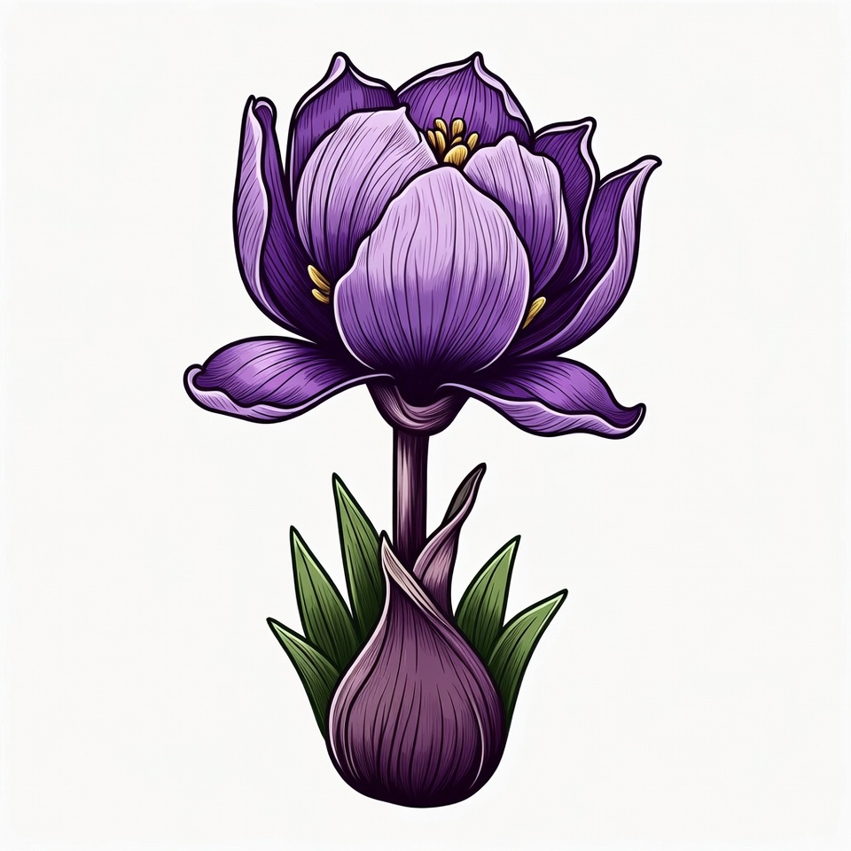 A vibrant purple crocus flower illustration features layered lavender petals with yellow stamens at the center. The flower stands on a slender green stem with pointed leaves and a bulb at the base. It is rendered in a detailed hand-drawn style on an isolated white background.
