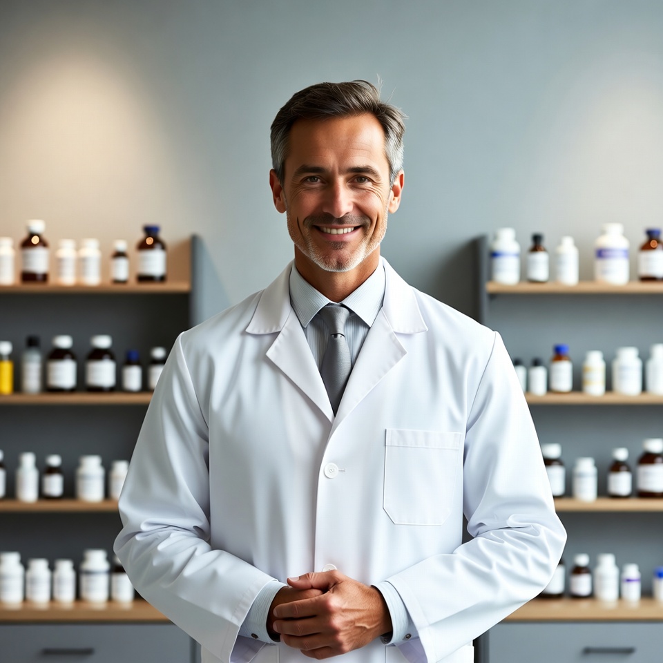 A middle-aged man with short graying hair and a friendly smile stands in front of pharmacy shelves stocked with colorful medicine bottles. He wears a white lab coat over a dress shirt and tie, with hands clasped in front. The background features a modern gray wall and wooden shelving units filled with various vials and containers.
