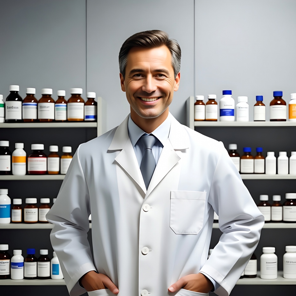 White, bottles, clinic, confident, dress shirt, drugs, gray background, hands in pockets, healthcare, lab coat, male, man, medical, medicine bottles, middle-aged, pharmacist, pharmacy, professional, shelves, smiling, standing, tie, vials, white coat, doctor