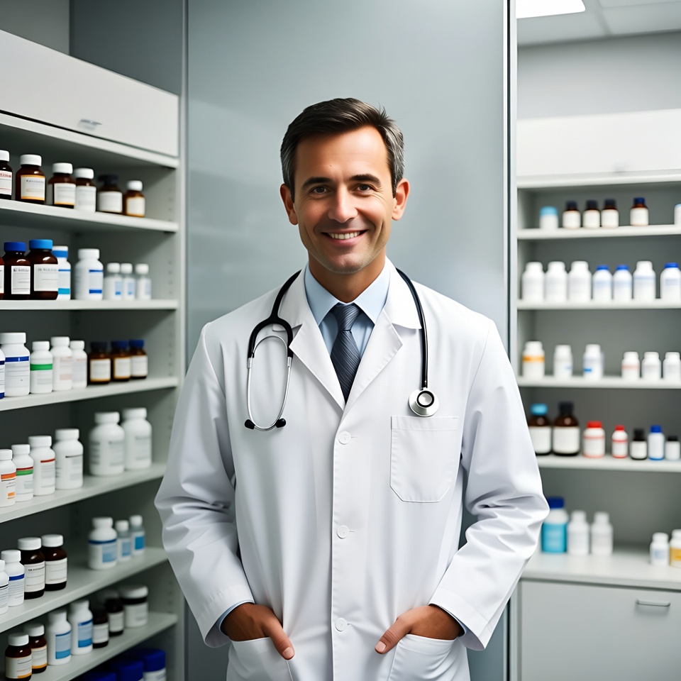 A middle-aged man with short brown hair stands smiling in a pharmacy surrounded by shelves of colorful medicine bottles. He wears a white lab coat, stethoscope around his neck, blue tie, and dress shirt. His hands are in his pockets against a gray wall with cabinets.