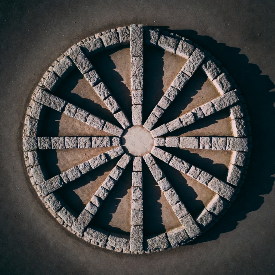 abstract design, aerial view, architecture, circular pattern, construction, drone photo, geometric, gray stones, hub, masonry, outdoor, pattern, pavement, radial pattern, round structure, shadows, spokes, stone blocks, stone pavement, stone wheel, texture, top view, wheel design, circular stone