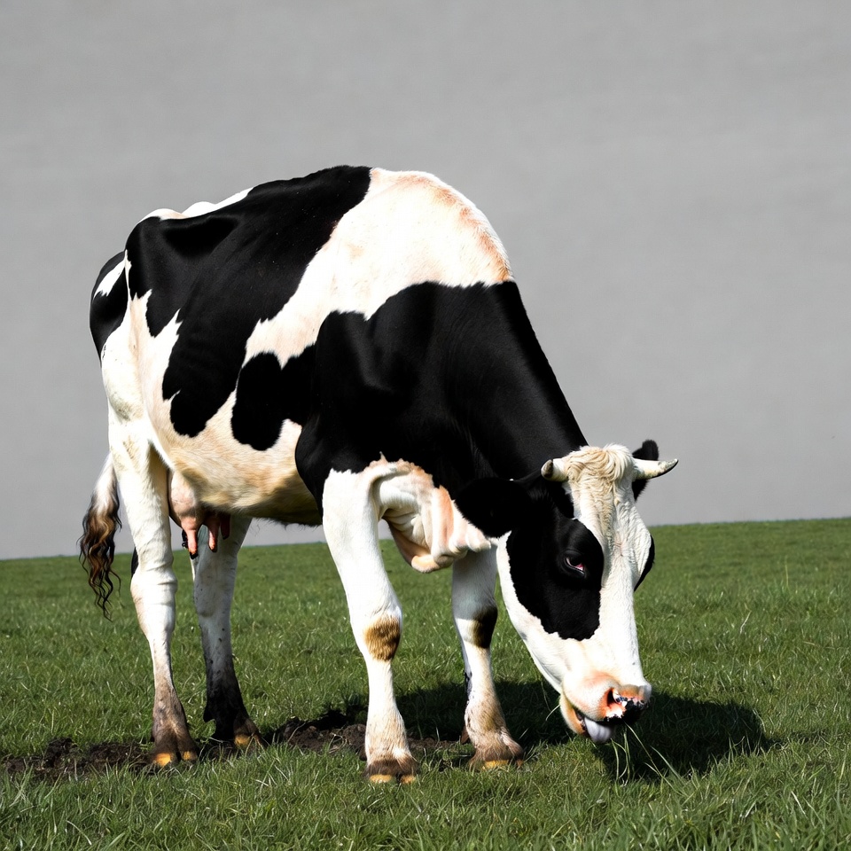 Holstein cow, animal, black and white cow, bovine, dairy cow, eating grass, farm animal, grass field, grazing cow, hooves, horns, livestock, outdoors, pasture, spotted cow, udder, cow