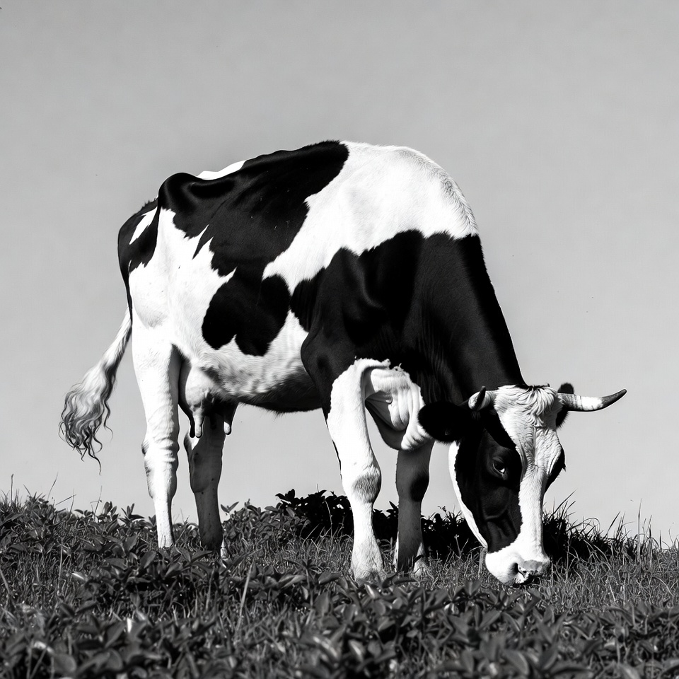 Holstein cow, animal, black and white, bovine, dairy cow, eating grass, farm animal, field, grass, grazing, horns, livestock, monochrome, pasture, photography, side view, cow