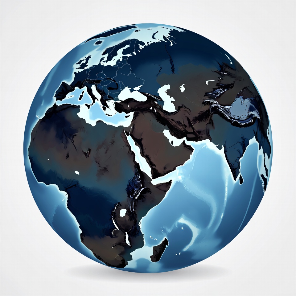 A detailed illustration of the Earth globe shows continents in dark shades against blue oceans. Europe, Africa, Asia, and other landmasses are prominently visible with white polar ice caps. The planet is centered on a transparent isolated background.