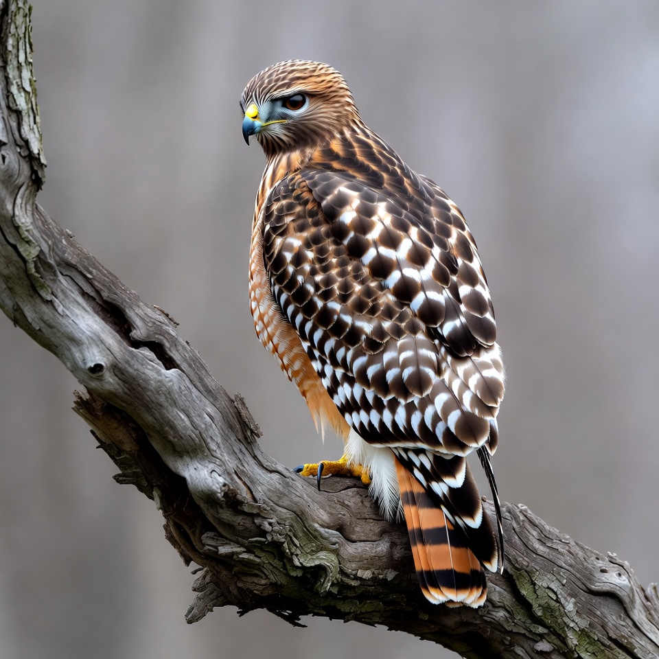 A red-tailed hawk with intricate brown and white feathers sits perched on a gnarled tree branch. Its sharp yellow beak and intense eyes face slightly to the side, with a blurred forest background. The hawk's orange tail feathers and talons are prominently visible.