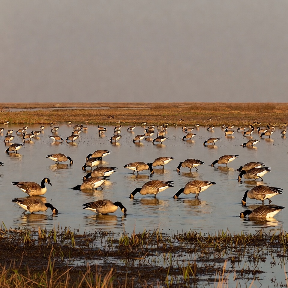 A large flock of Canada geese feeds in shallow marsh water during golden hour. The geese dip their heads into the water amid reeds and grasses under a hazy sky. Sunlight casts warm tones over the wetland landscape.