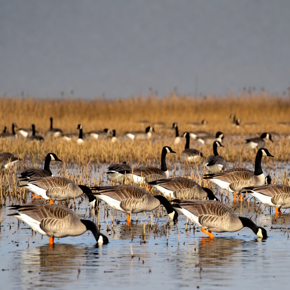 autumn reeds, bird group, birds, black neck, feeding geese, flock, foraging, geese flock, golden grass, marsh, nature, orange feet, reeds, shallow water, waterfowl, wetland, white chinstrap, wild geese, wildlife, Canada geese