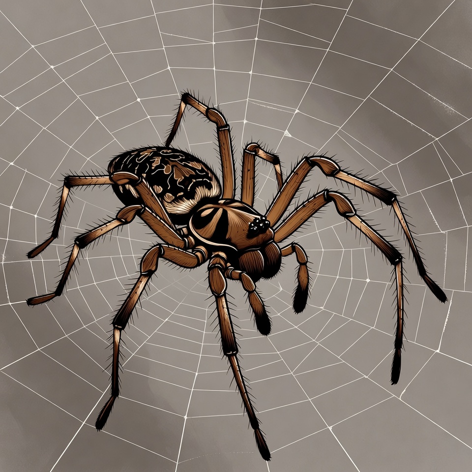 arachnid, brown spider, creepy crawly, digital art, illustration, insect art, isolated background, legs, pattern markings, spider web, web strands, wildlife, spider