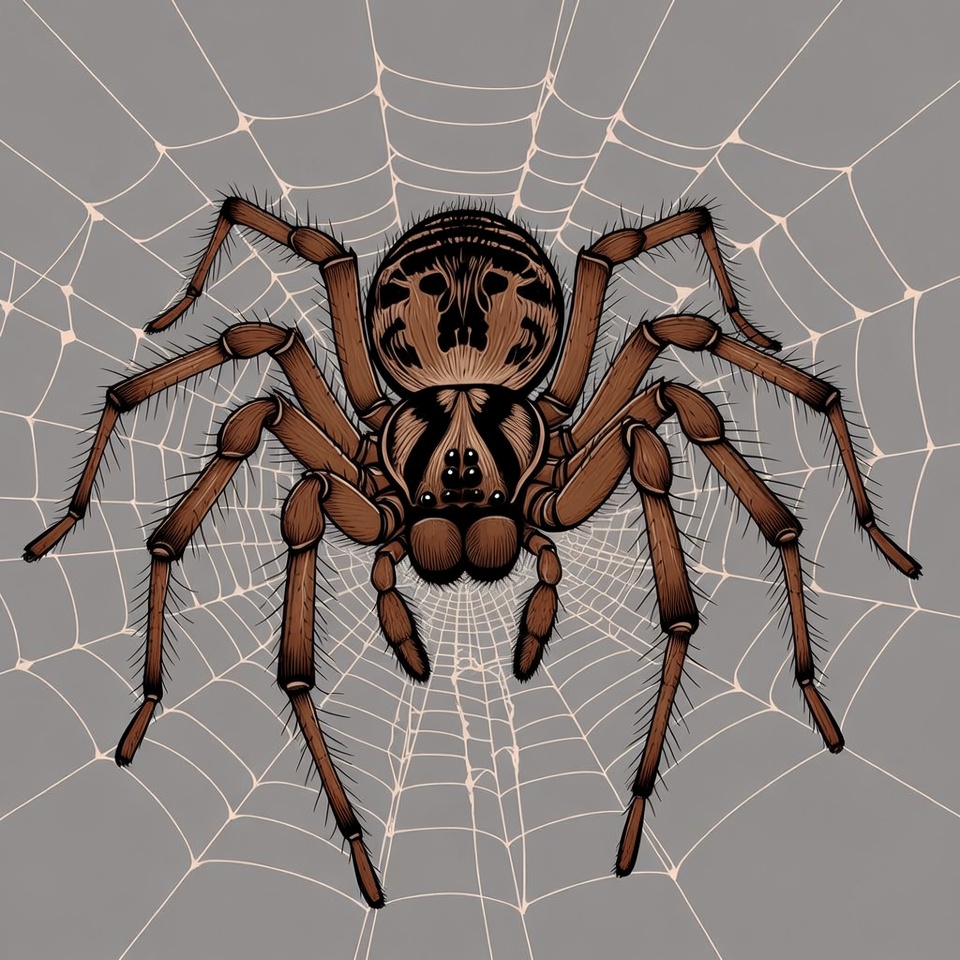 animal, arachnid, brown spider, clipart, creepy crawly, detailed drawing, eight legs, eyes, fangs, hairy legs, illustration, insects, isolated background, spider, spider web, tattoo design, vector art, web, wolf spider