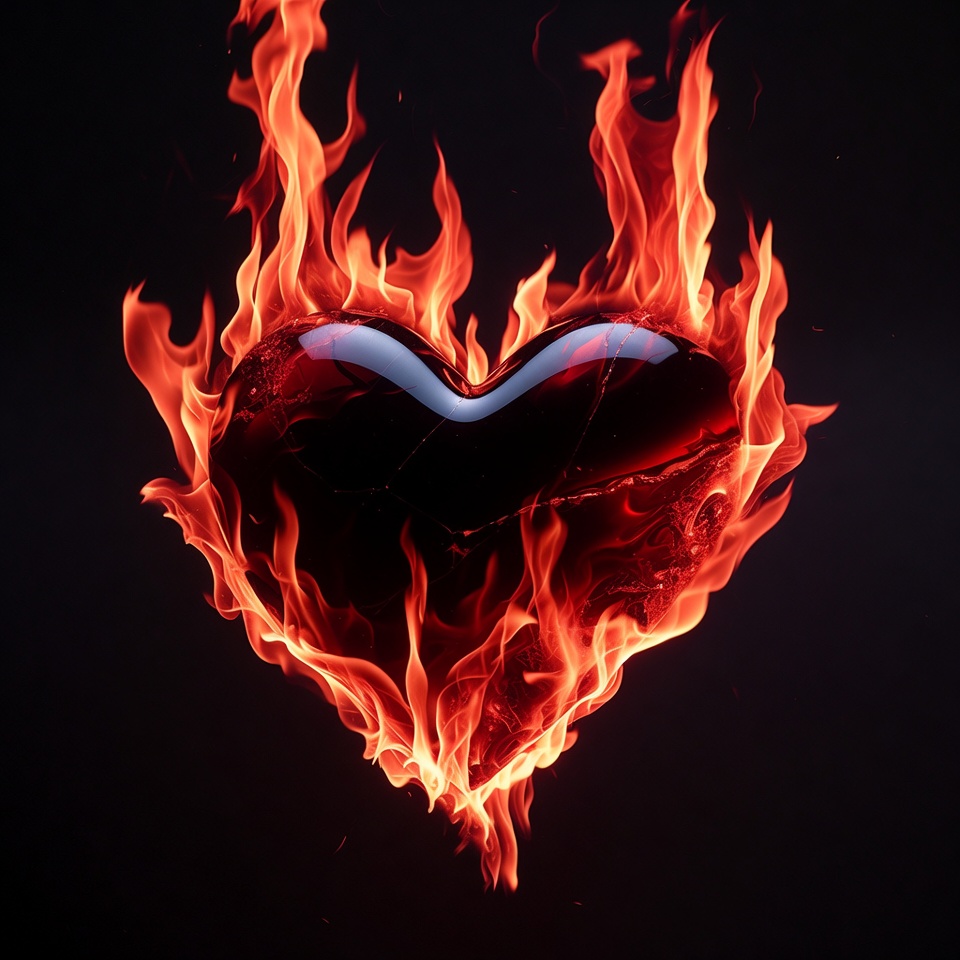 3D render, black heart, digital art, fiery heart, fire, fire heart, flames, flaming heart, glossy heart, heart shape, isolated background, love fire, orange flames, passion symbol, red fire, burning heart
