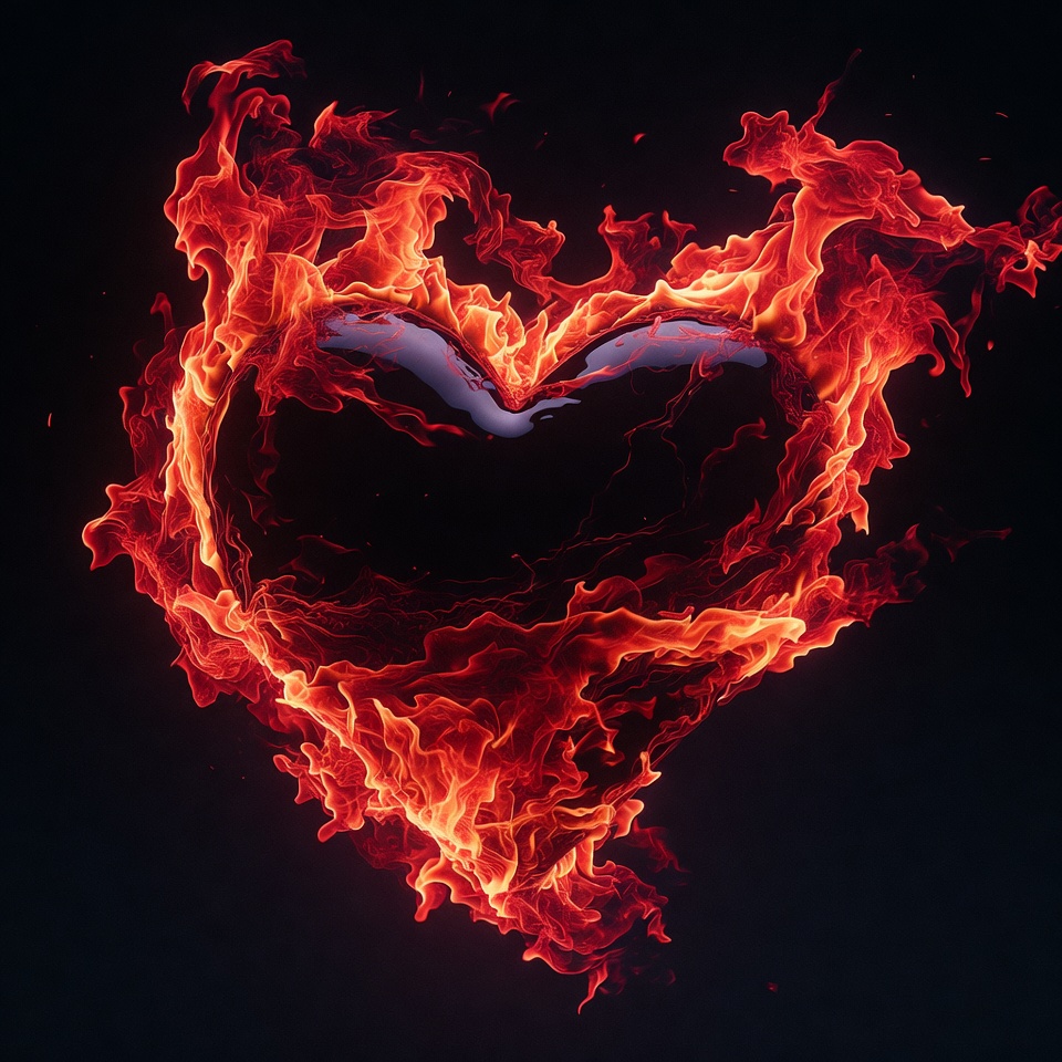 A fiery heart shape burns intensely against a black background. Flames in vibrant red and orange tones form the outline of the heart with a dark glossy center. The dynamic fire effects create a glowing, molten appearance.