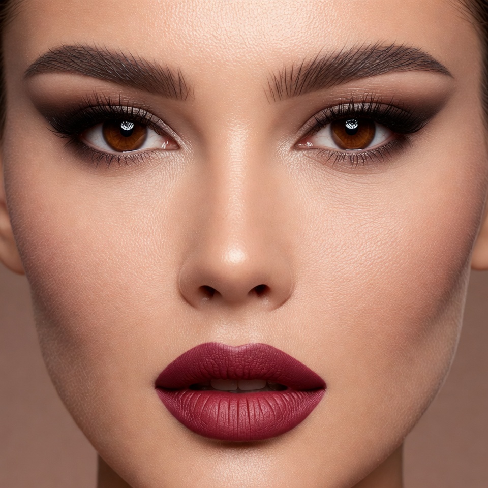 A close-up portrait of a woman with striking brown eyes enhanced by dark eyeliner and long lashes. She has full lips painted in deep red matte lipstick and smooth skin. The image features a soft neutral background.