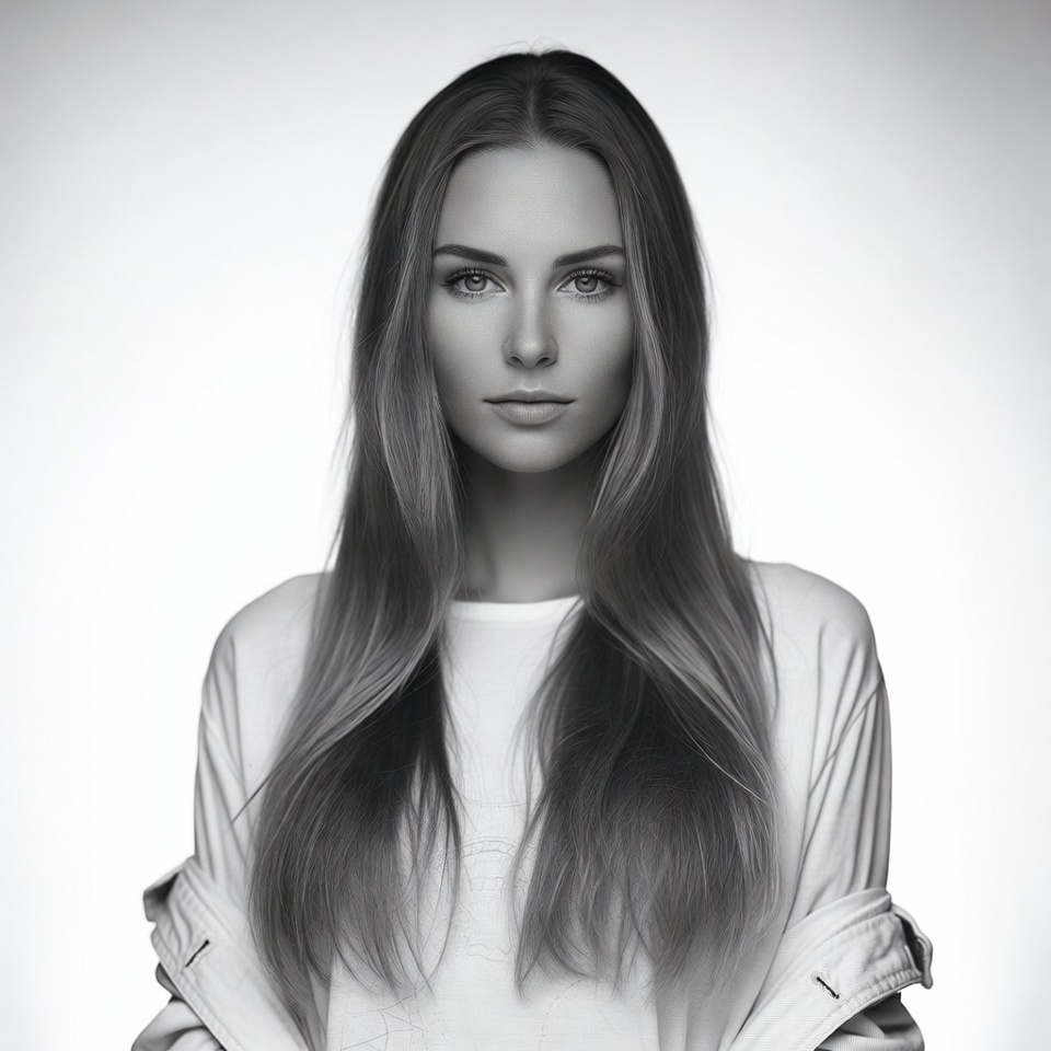 White, beautiful, black and white, direct gaze, elegant, face closeup, female, hair flowing, headshot, isolated background, long hair, model pose, monochrome, portrait, serious expression, simple clothing, straight hair, white top, young woman, woman