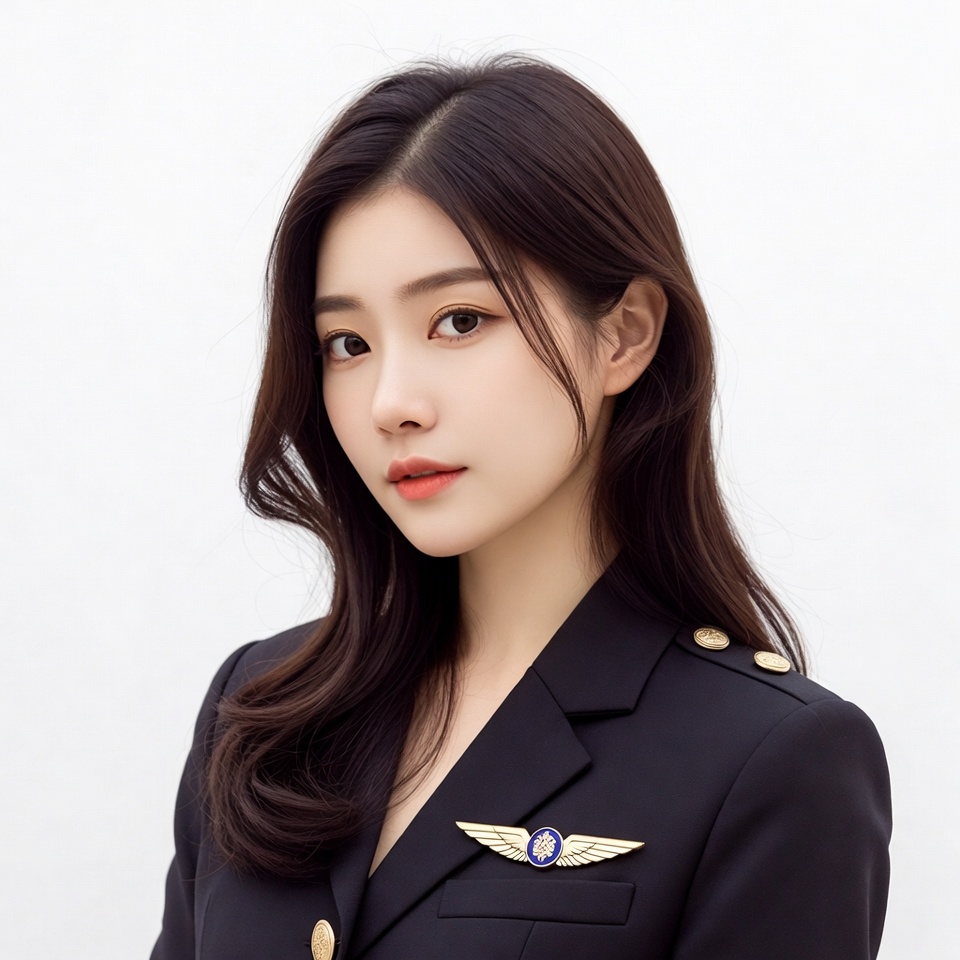 A young Asian woman with long dark hair stands smiling against a white background. She wears a black flight attendant uniform with gold buttons and a blue winged badge on the lapel. Her hair is parted in the middle and falls over her shoulders.