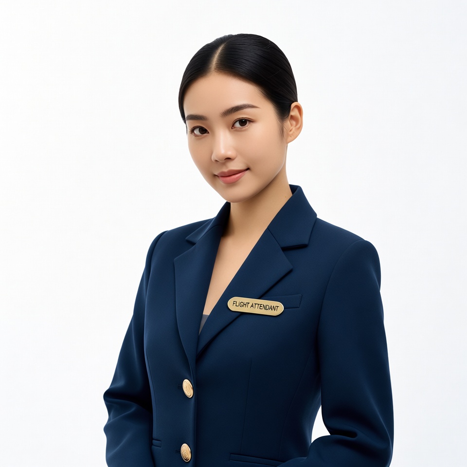 A young Asian woman with straight black hair in a bun stands smiling at the camera. She wears a tailored navy blue flight attendant uniform with gold buttons and a name badge labeled 'Flight Attendant'. She poses confidently against a plain white background.