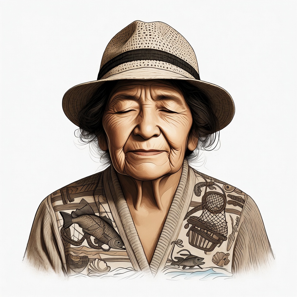 Asian, beige hat, closed eyes, curly hair, digital art, female, fish sweater, fisherwoman, fishing hat, gray hair, illustration, isolated background, net design, portrait, seafood pattern, senior, straw hat, traditional clothing, wrinkled face, elderly woman