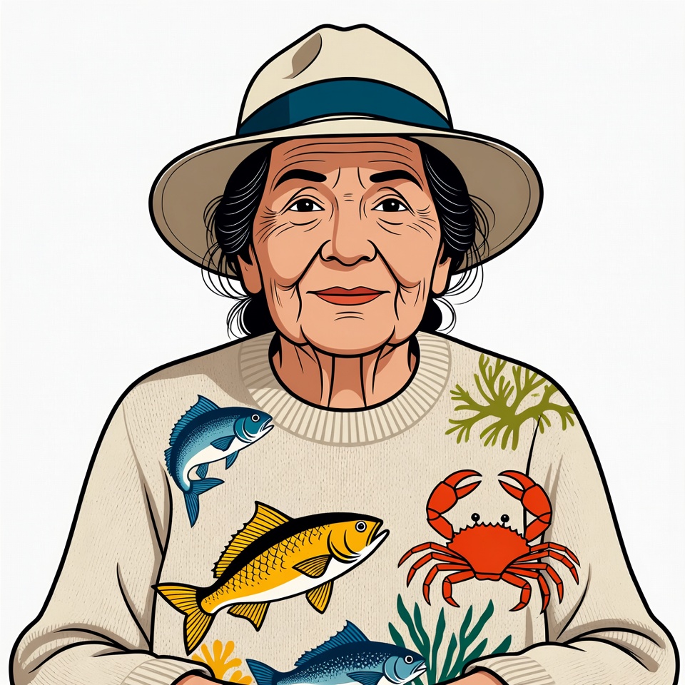 An illustration of an elderly woman with short dark hair wearing a wide-brimmed beige hat with a blue band. She smiles warmly while wearing a cream-colored sweater decorated with colorful fish, crabs, and seaweed. The vector art features her against a white background.