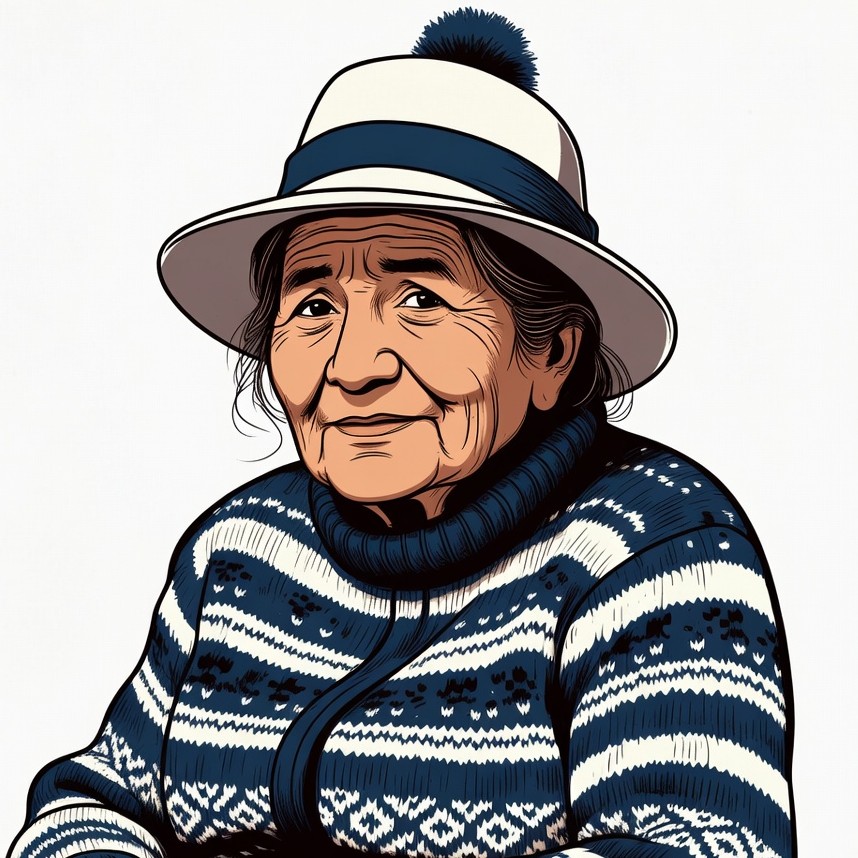 Indigenous, andean style, blue pom-pom, clipart, cozy clothing, elderly woman, ethnic portrait, female, illustration, isolated background, knitted sweater, mature woman, navy sweater, portrait, smiling woman, striped sweater, traditional hat, white hat, indigenous woman