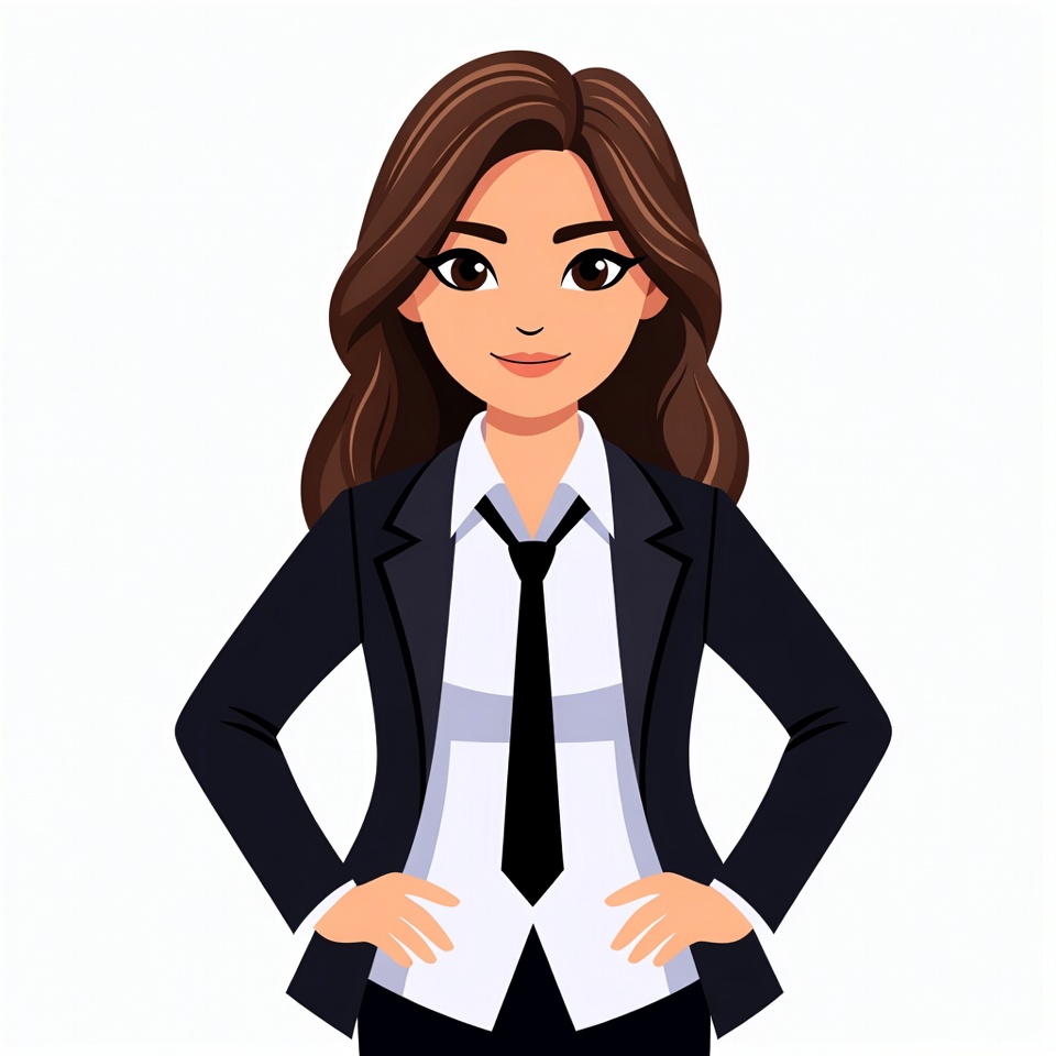 Asian, black tie, brown hair, business suit, businesswoman, clipart, confident pose, dark blazer, female, formal attire, hands clasped, happy expression, illustration, isolated background, long hair, professional woman, smiling, standing pose, vector art, white shirt, cartoon woman