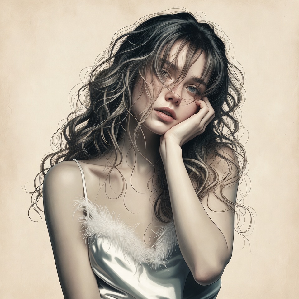A young woman with long wavy dark hair rests her chin on her hand in a close-up portrait. She wears a thin-strapped silky dress with feather trim and gazes thoughtfully with blue eyes. The image features a soft beige background in a digital illustration style.