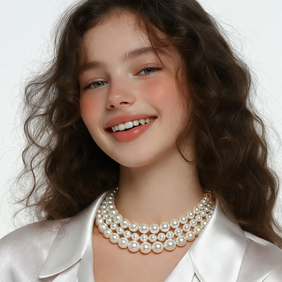 A young girl with long wavy brown hair smiles at the camera against a white background. She wears a white satin blouse and a multi-strand pearl necklace. Her makeup features pink blush and glossy lips.