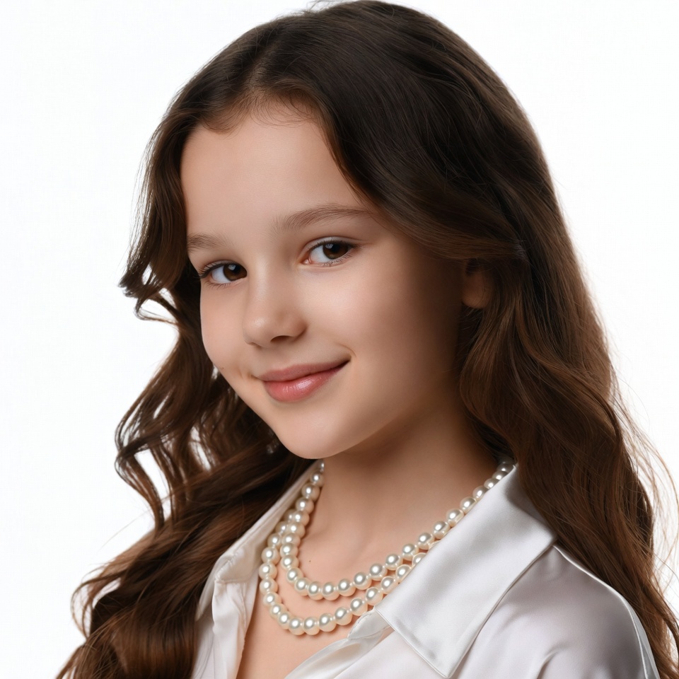A young girl with long wavy brown hair smiles at the camera against a white background. She wears a white collared shirt and a double strand pearl necklace. Her expression is cheerful with bright eyes.