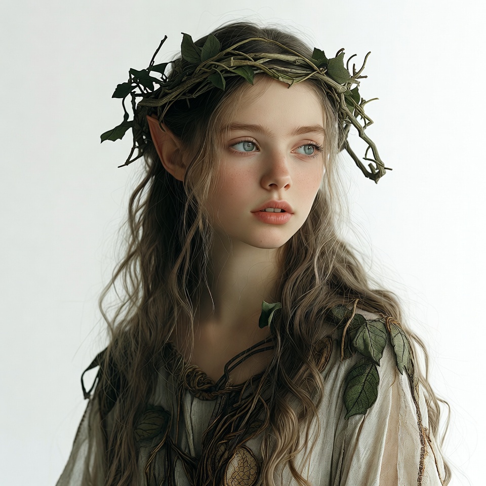 A young woman with long wavy light brown hair wears a crown of green leaves and vines on her head. She has pointed elf ears and is dressed in a white garment adorned with green leaves and vines. She poses against a plain white background.