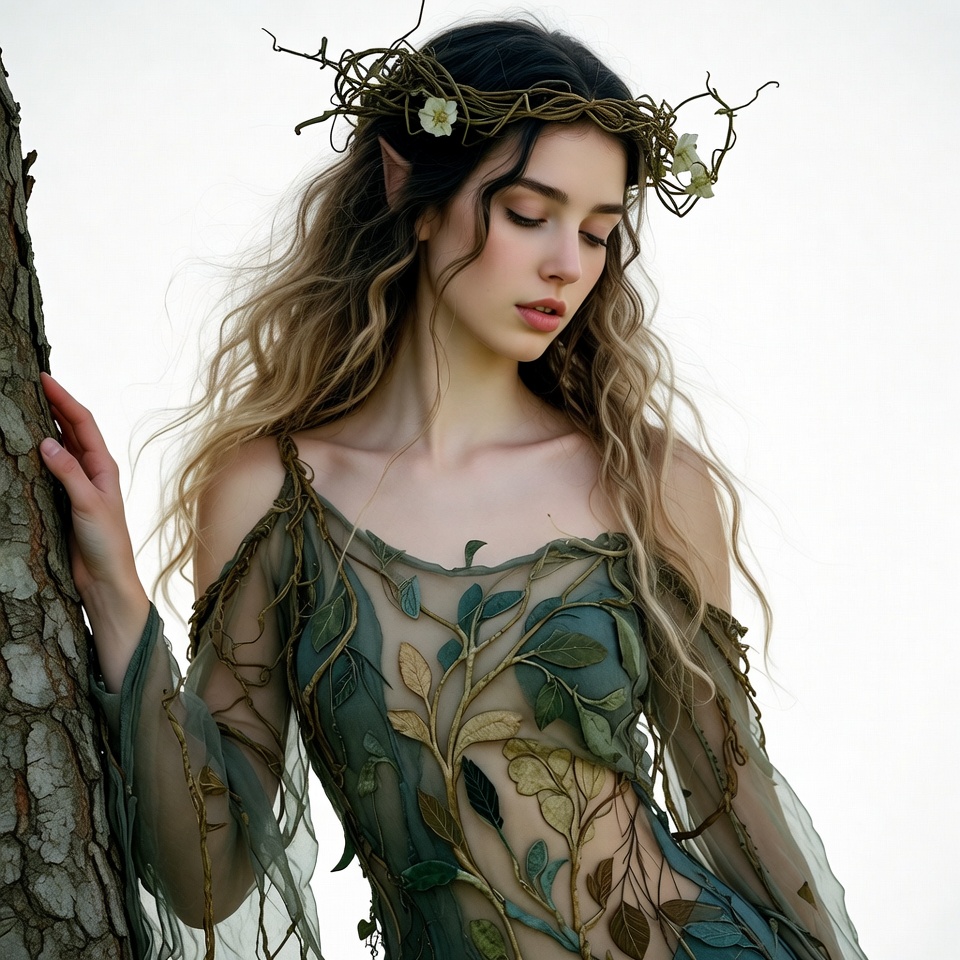 White, blonde hair, elegant woman, ethereal, fantasy costume, fantasy woman, female, floral crown, forest elf, green dress, hand on tree, leaf patterns, leafy dress, long hair, mystical, nature dress, portrait, serene face, sheer fabric, tree trunk, vine crown, wavy hair, white background, white flowers, elf woman