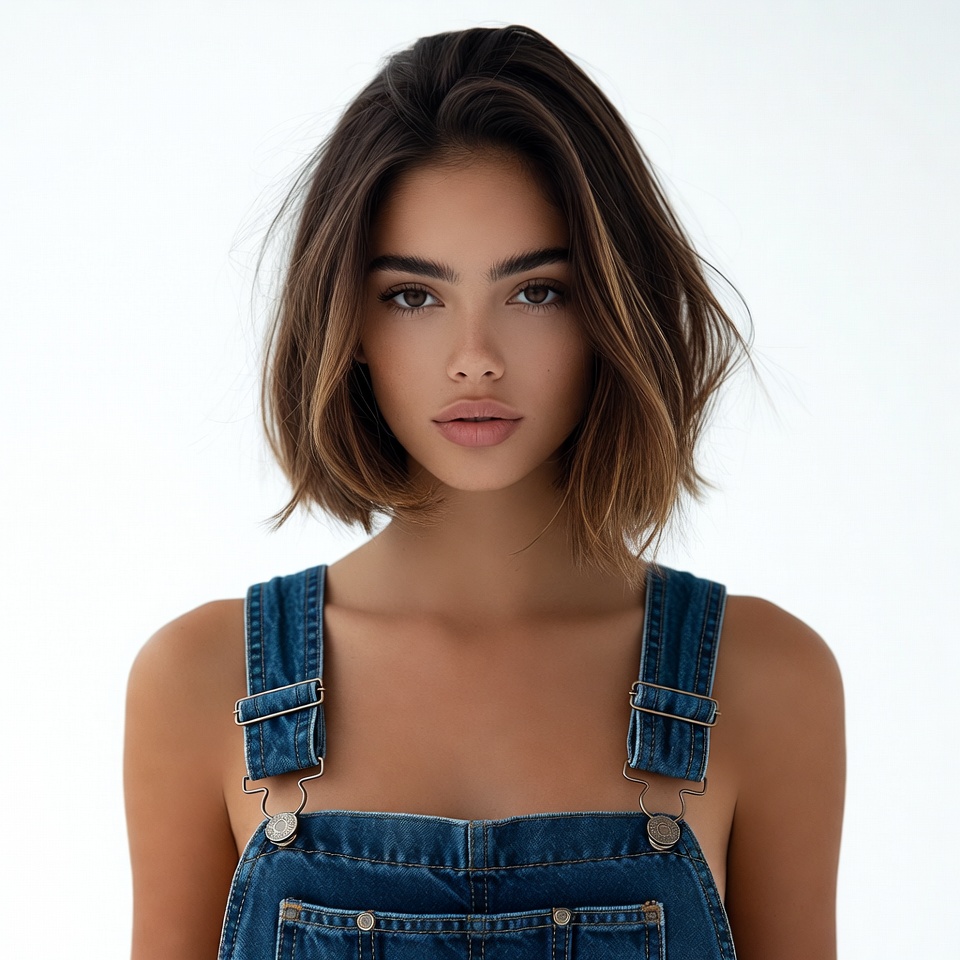 bare shoulders, beautiful woman, blue overalls, bob haircut, brown hair, denim overalls, female, full lips, headshot, makeup, portrait, striking eyes, wavy hair, white background, young woman, woman