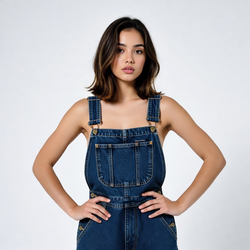 A young Asian woman with shoulder-length dark brown hair stands confidently against a white background. She wears sleeveless blue denim overalls with straps over her shoulders and hands on her hips. Her expression is neutral with a slight pout.