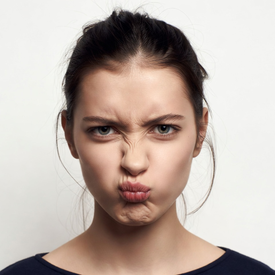 closeup, dark hair, duck face, fair skin, female, furrowed brows, gray eyes, grumpy face, headshot, intense eyes, ponytail, portrait, pout, pursed lips, serious expression, white background, young woman, woman