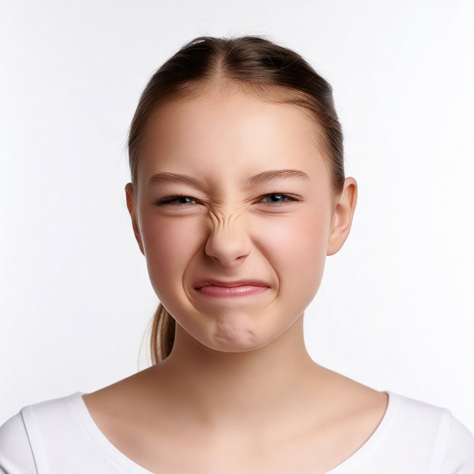 White, brown hair, child, close-up, facial expression, female, funny face, humorous expression, kid, ponytail, portrait, pursed lips, scrunched face, silly face, squinting eyes, white background, white top, wrinkled nose, young girl, girl