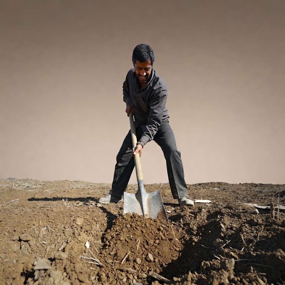 A man with short dark hair is digging into dry brown soil using a wooden-handled shovel. He wears a gray shirt, pants, and white shoes, bending forward with effort. The background is a plain beige gradient.
