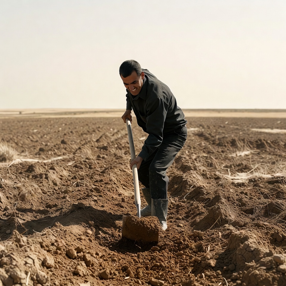 A Middle Eastern man in dark jacket, pants, and white boots digs into brown soil with a shovel in a vast arid field. He crouches forward with a smile on his face amid scattered dirt piles and sparse vegetation. The background shows expansive dry farmland under a hazy sky.