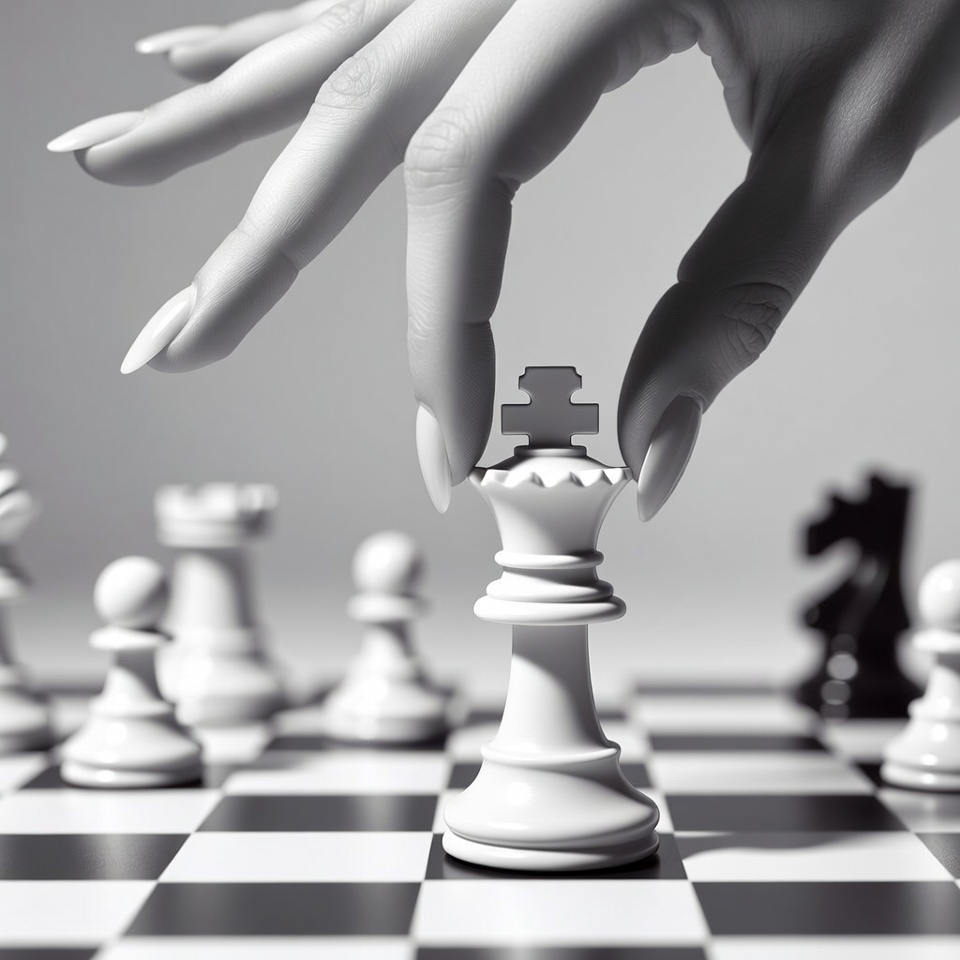 A woman's elegant hand with long nails holds a white chess king piece above a chessboard. The black and white checkered board features several white and black chess pieces, including pawns, rooks, and a black king. The image is in high-contrast black and white.