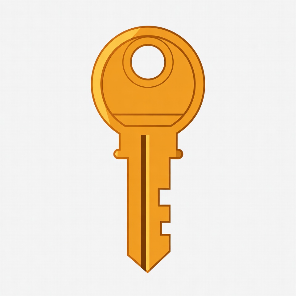 A simple golden key illustration features a round bow with a keyhole and a straight shaft with teeth. It is depicted in a flat cartoon style on a white isolated background.