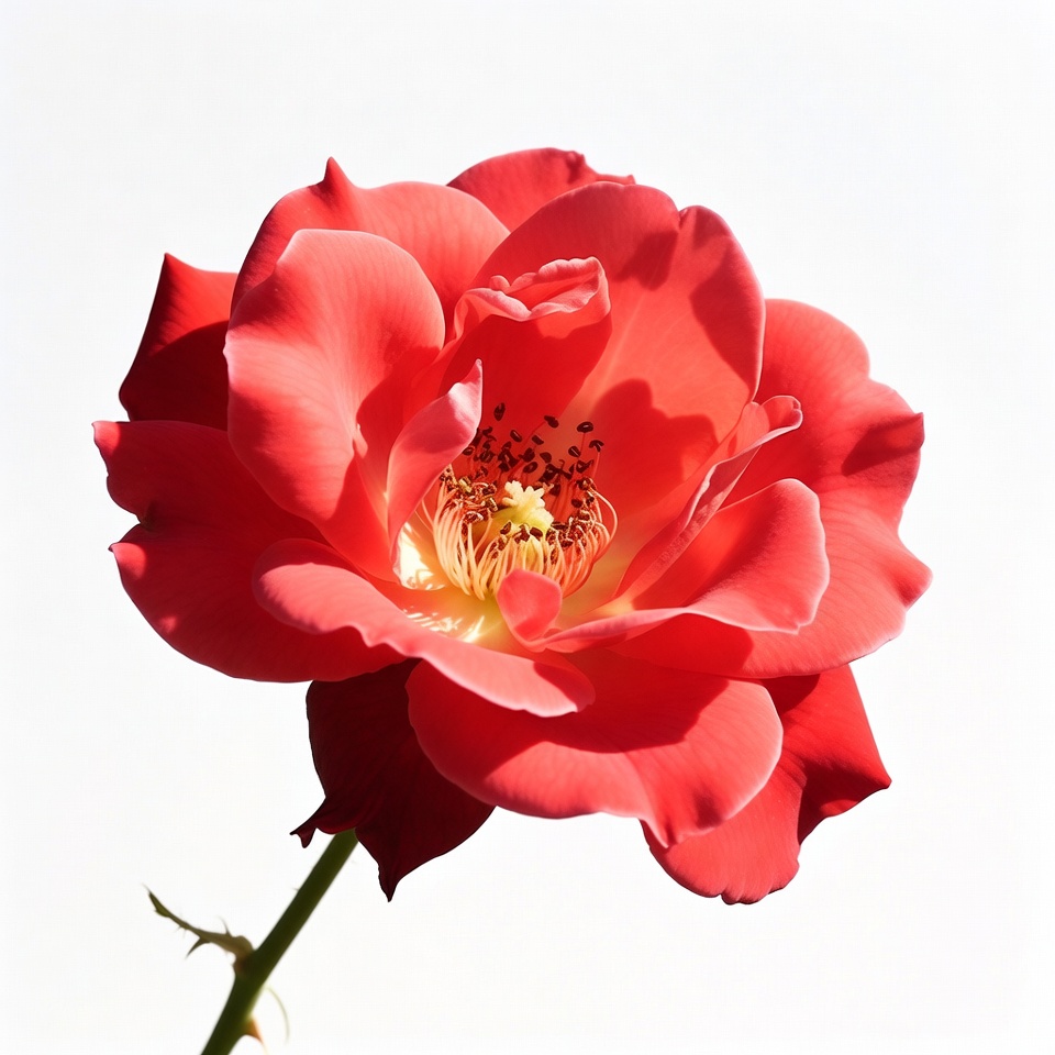 bloom, closeup, floral, flower, green stem, isolated, nature, petals, pink petals, red flower, rose flower, vibrant, white background, yellow stamens, red rose