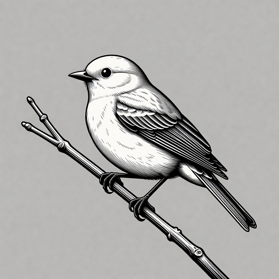 animal, avian, beak, branch, engraving style, feathers, illustration, isolated background, line art, nature, perched bird, small bird, songbird, white bird, wildlife, bird